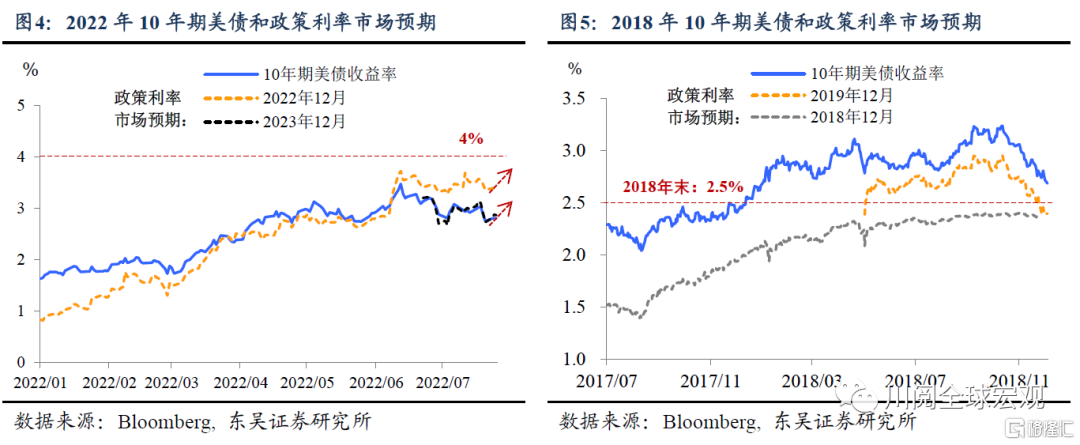美债:6月以来美债收益率触顶回落的主要宏观逻辑是预期美国经济衰退和2023年的降息,我们认为这一定价过度了。市场当前预期2022年内美联储加息至3.5%,而这一纠偏过程无疑会带来政策利率预期和长端美债收益率的上行。类似的情形在2018年也出现过,在经济下行压力上升的情况下,当年10月初美联储主席鲍威尔一句“当前离中性利率仍有一段长路”(we’re ‘a long way’ from neutral on interest rates)的言论令10年期美债收益率二次触顶(图4和5)。