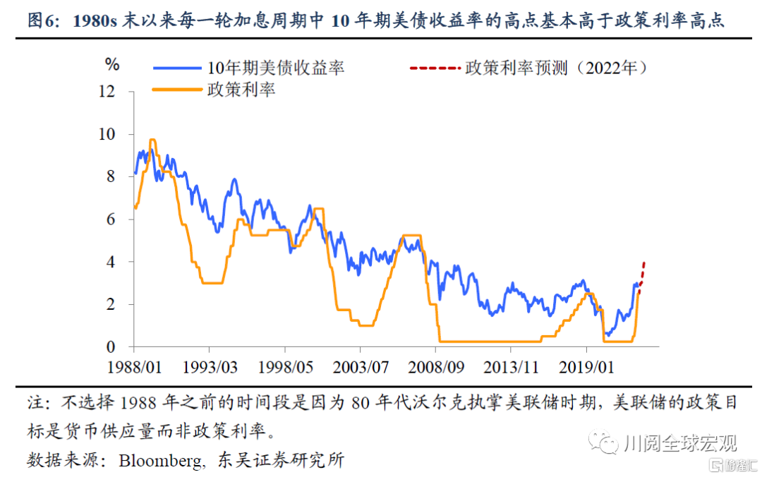 而且值得注意的是,从历史上看,在美联储以利率作为政策目标的时期,10年期美债收益率的高点往往不低于联邦基金利率的高点(图6)。