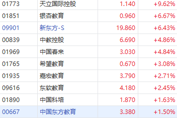 教育股集体爆发,新东方在线涨12%,天立控股涨逾9%,银杏教育、新东方涨超6%,中国春来、中教控股等涨约5%。