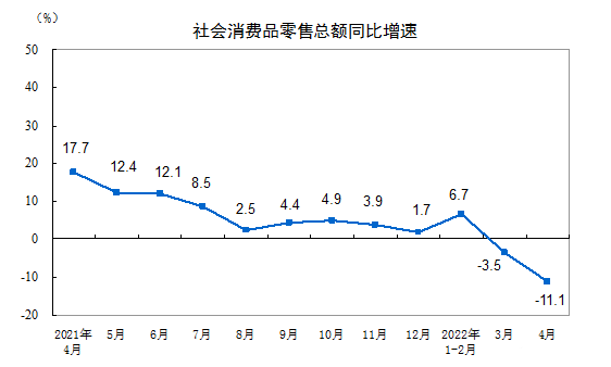 疫情叠加宏观环境趋弱,国内社会消费品零售总额同比增速出现了较大的下滑。4月,社零总额同比下滑幅度高达11.1%,消费者已经不太愿意花钱了。