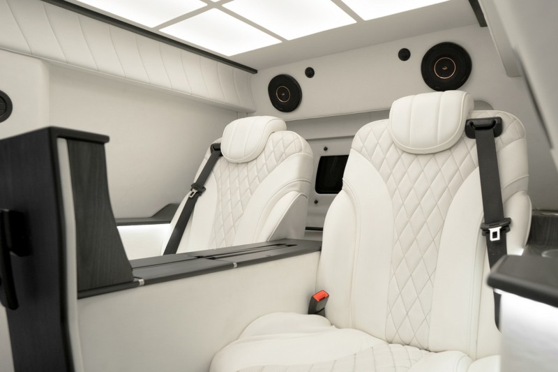 装甲版凯迪拉克凯雷德“Chairman”车身轴距达3406mm,并配备大尺寸多辐式熏黑轮圈与防弹轮胎。车尾部分,两侧纵置LED尾灯组点亮后辨识度较强,双边共双出矩形排气系统结合宽大的后包围组件极具气势。值得一提的是,该车在尾门内侧带有装甲护板并配备防弹玻璃为用户提供全方位的保护。