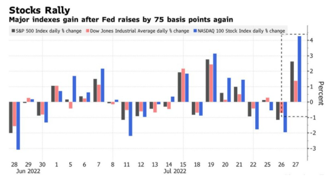 美联储大幅加息后,美股连续第三次出现利率决议当日飙升,与上两次加息反弹后发生的情况如出一辙,这削弱了美股进一步上涨的希望。5月和6月,由于投资者分析了美联储主席鲍威尔的讲话,并重新调整了对政策举措可能走向的预期,股市大幅上涨之后出现了更大的抛售。周三,在标普500指数飙升2.6%、纳斯达克100指数创下2020年11月以来的最大涨幅后,华尔街各地迅速发出了次日可能再次下跌的警告。贝莱德分析师Jeffrey Rosenberg表示:“市场走势展现了希望战胜经验。但我在这方面要谨慎一点。市场在等待经济放缓,而没有考虑到市场越上涨,就越难继续下去。”