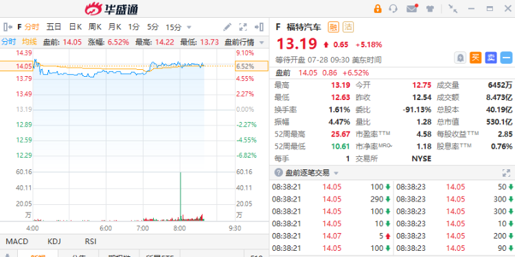 福特汽车 $F Q2业绩超预期 盘前涨超6%