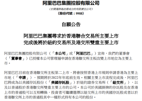 此前的2019年,阿里巴巴曾于香港联交所主板第二上市,至此该公司大部分流通股已转至香港注册。此次该公司按照香港上市规则申请香港为主要上市地,预期将于2022年年底前生效。