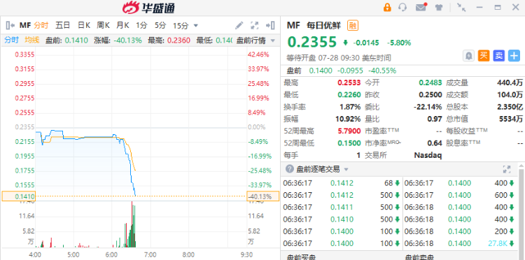 华盛资讯7月28日消息,美股盘前,每日优鲜(MF)跌幅扩大,截至发稿,该股跌超40%;每日优鲜今日回应“解散”传闻,由于业务调整,部分员工离职;此前也回应极速达业务关闭:为实现盈利大目标对前置仓业务进行调整,其他业务不受影响。