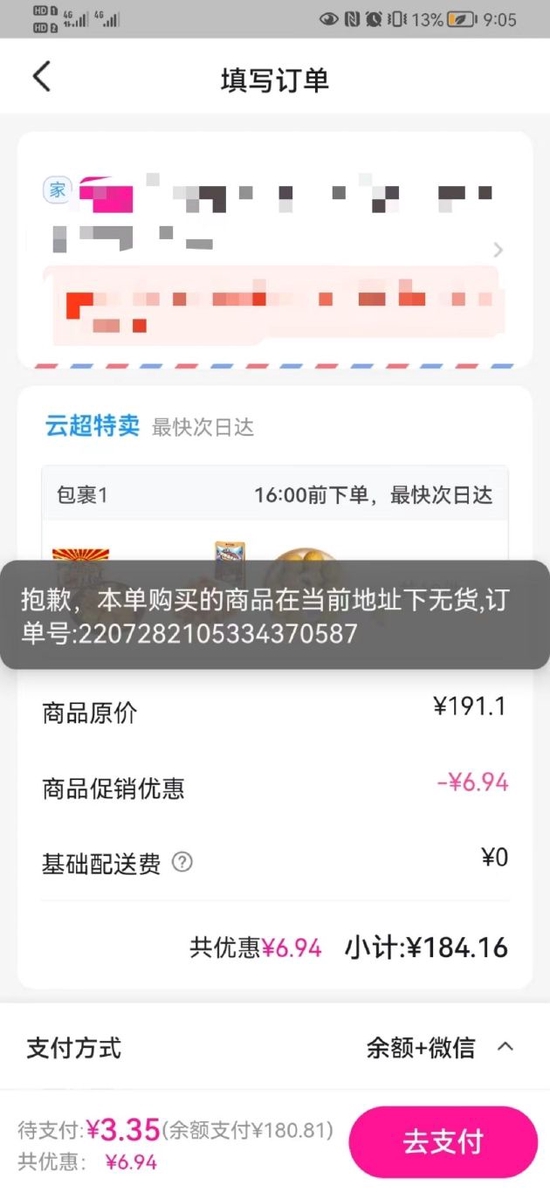 新浪科技讯 7月28日晚间消息,新浪科技发现,每日优鲜App已经无法下单,虽然仍有商品展示、可加入购物车,但是在结账页面显示“本单购买的商品在当前地址下无货”。新浪科技更换了上海、杭州等多个城市,均显示无货原因无法购买。