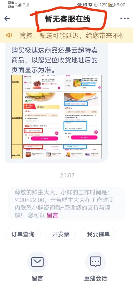 新浪科技欲就每日优鲜剩余储值款问题咨询在线客服,却发现客服页面显示暂无客服在线,仅支持留言。但正常情况下当前仍处于客服服务时间,客服对话页面也显示客服服务时间为9:00-22:00。