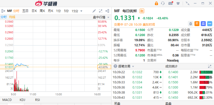 华盛资讯7月27日消息,热门中概股多数下挫,截至发稿,每日优鲜跌超43%,报0.1331美元。今日有消息称,每日优鲜融资未能交割成功,公司解散。有记者探访每日优先总部,了解到每日优鲜已于7月28日内部发起大规模裁员动作。