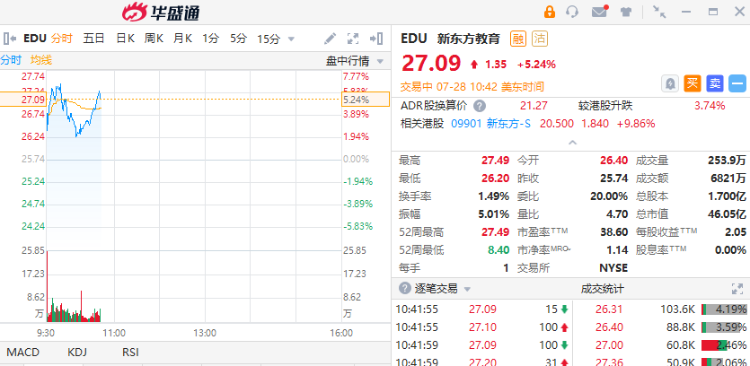 新东方教育涨逾5%,报27.09美元。