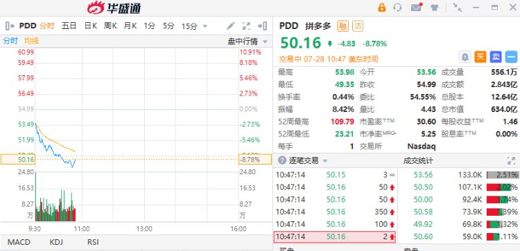 拼多多跌超8%,报50.16美元,成交额2.843亿美元。叮咚买菜跌超8%,阿里巴巴、哔哩哔哩跌逾6%,金山云、京东、法拉第未来、理想、小鹏跌超4%,蔚来、百济神州跌超3%。