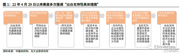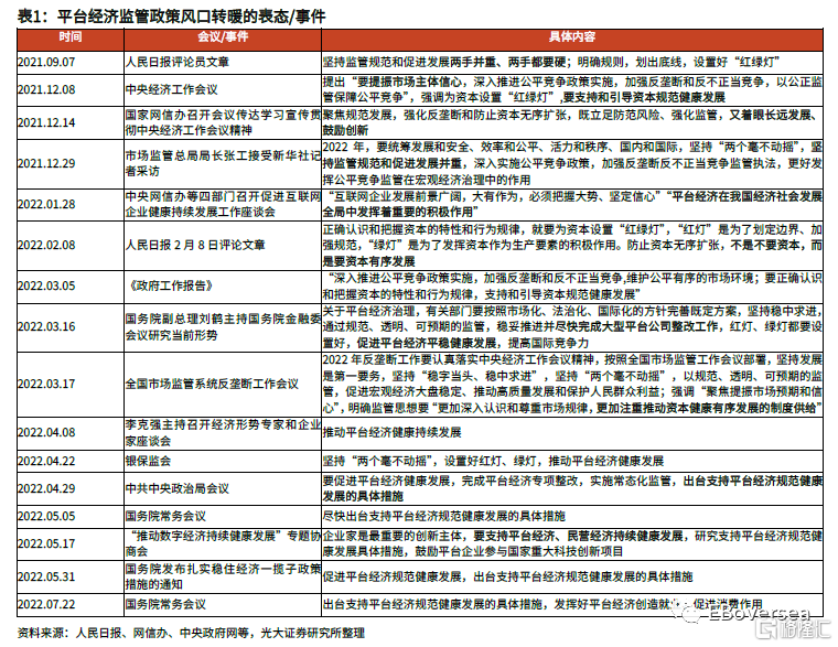集中推出一批“绿灯”投资案例意味着什么?“支持性”基调进一步加强。1)4月29日政治局会议、5月5日国务院常务会议、5月17日“推动数字经济持续健康发展”专题协商会、5月31日《国务院关于印发扎实稳住经济一揽子政策措施的通知》、7月22日国务院常务会议均强调要“出台支持性具体措施”。2)此次政治局会议还特别强调“发挥企业和企业家能动性,营造好的政策和制度环境,让国企敢干、民企敢闯、外企敢投”。我们认为,此次政治局会议更加明确“支持性具体措施”的方向,预计未来将出台平台企业的“投资清单”或者投资相关规定,为平台企业的投资领域提供更加清晰明确的界定。