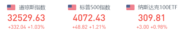 美股7月28日周四收盘,道指涨332.04点,涨幅为1.03%,报32529.63点;纳指涨130.17点,涨幅为1.08%,报12162.59点;标普500指数涨48.82点,涨幅为1.21%,报4072.43点。