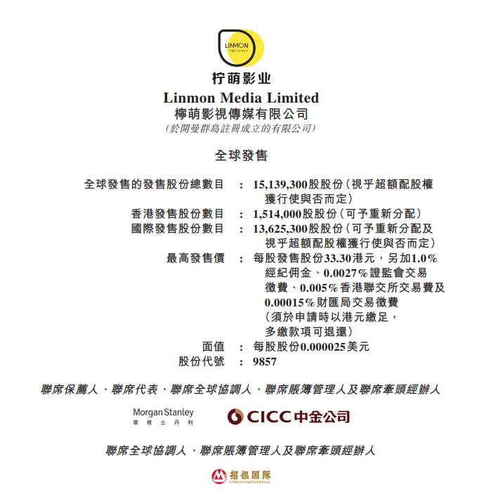 华盛资讯7月29日消息, 柠萌影视(09857)于2022年7月29日-8月3日招股,该公司拟发行1513.93万股,预期股份将于2022年8月10日上市买卖。前往新股中心,申购新股>>