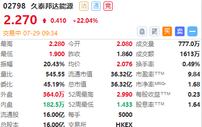 华盛资讯7月29日消息,久泰邦达能源(2798.HK)盘初大涨逾22%,报2.27港元,总市值36.32亿港元。