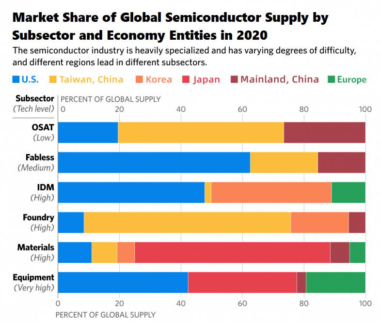 Foundry制造环节份额,主要由美国、韩国和中国台湾三个经济体瓜分。而其中大部分的先进制程半导体也都只能交给他们生产。