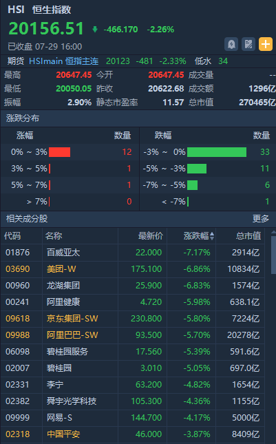 7月29日消息,美股三大指数连升第二日,升幅都超过1%,不过反映中概股表现的金龙中国指数低收1.4%,今日早盘,港股恒指高开低走,午后恒指跌幅持续扩大,截至收盘,恒指跌2.26%,报20156.51点,百威亚太大跌8%,领跌蓝筹,阿里、美团等跌超6%。科技、医药、消费、地产等板块集体大跌。