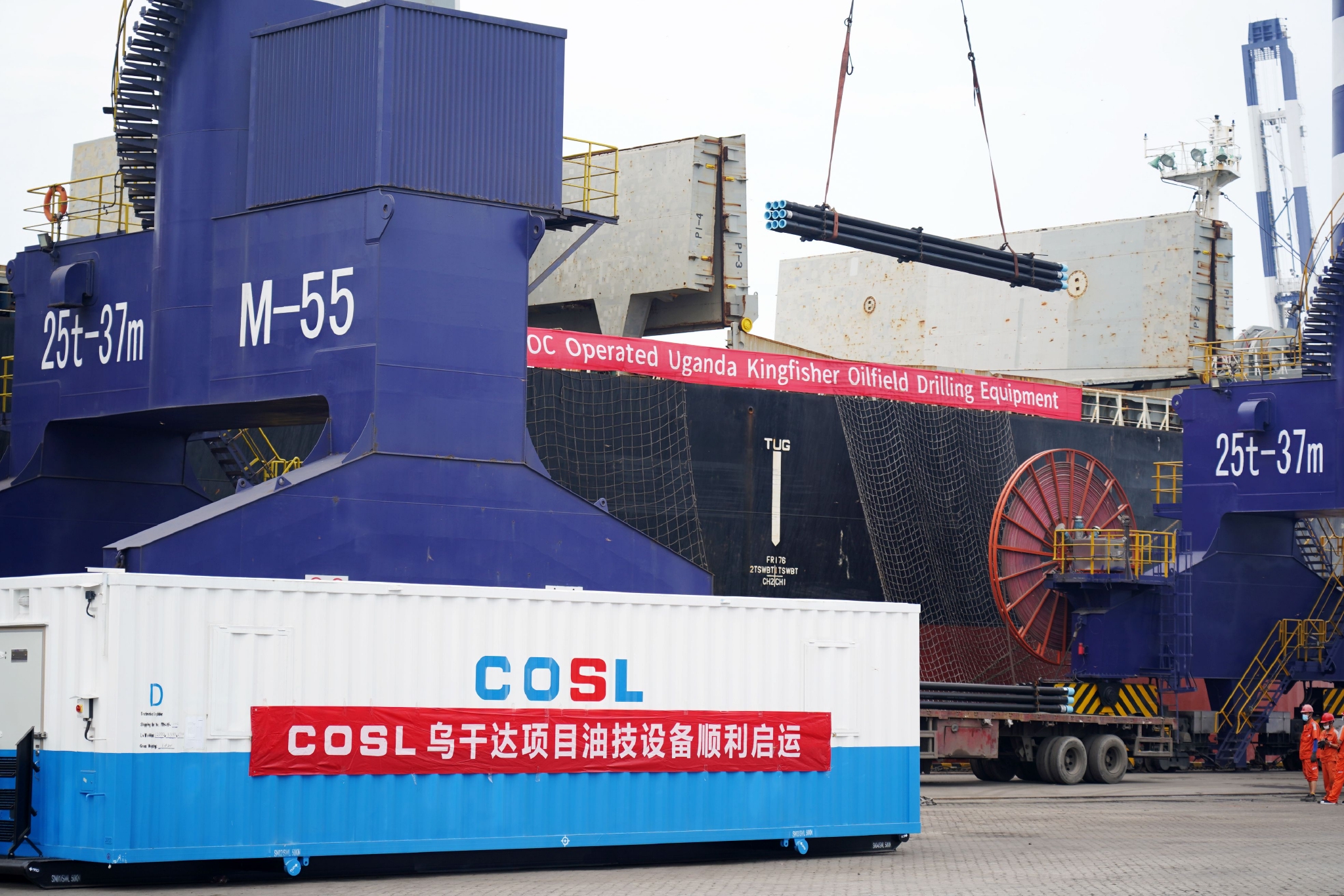 7月29日,中国为乌干达“量身定制”的高端石油装备在山东烟台港装船启运。