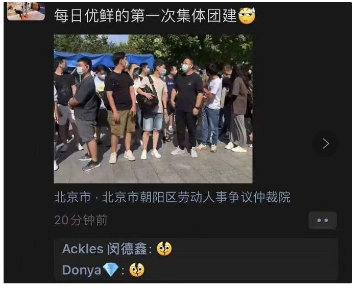 紧接着,网上曝出一张,“每日优鲜员工到北京朝阳劳动人事争议仲裁院申诉”的照片。照片显示,现场有大量人员焦虑的等待。一位每日优鲜员工自嘲,“第一次集体团建”。