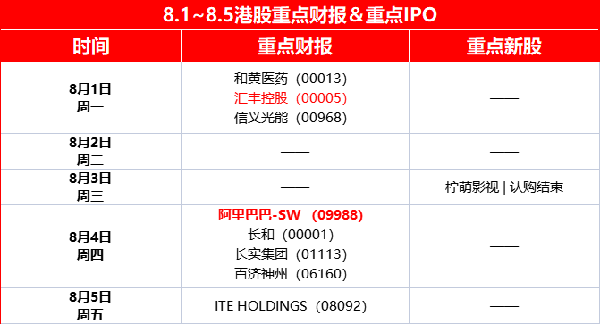 近期部分港股公司财报将陆续发布,重点关注阿里巴巴-SW、汇丰控股、和黄医药、长实集团、ITE HOLDINGS等;下周三柠萌影视认购结束。