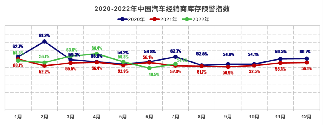 7月31日,中国汽车流通协会发布的“中国汽车经销商库存预警指数调查”VIA显示,2022年7月中国汽车经销商库存预警指数为54.4%,同比上升2.1个百分点,环比上升4.9百分点,库存预警指数位于荣枯线之上。综合预计,8月汽车市场好于上年同期。中国汽车流通协会建议,未来汽车市场不确定性加大,经销商要根据实际情况,理性预估实际市场需求,合理控制库存水平,切勿松懈疫情防护。