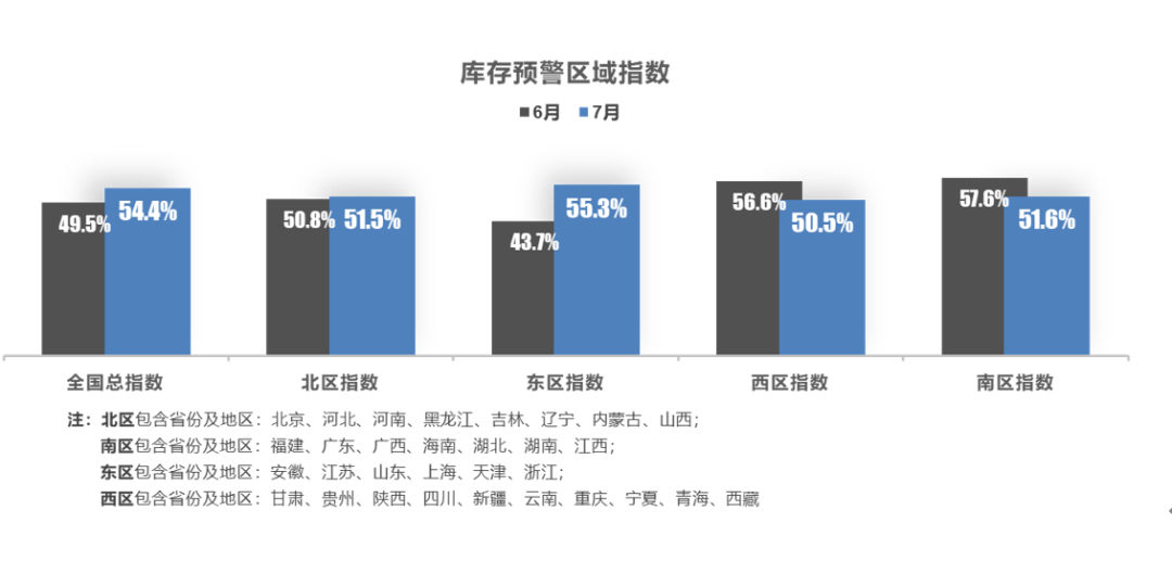 从区域指数情况看:7月全国总指数为54.4%,北区指数为51.5%,东区指数为55.3%,西区指数为50.5%,南区指数为51.6%。