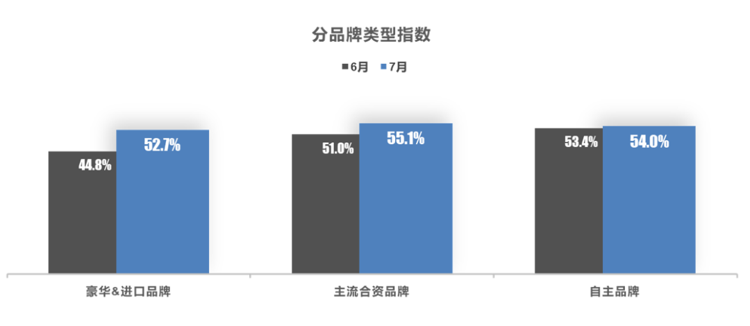 从分品牌类型指数看:7月进口&豪华品牌、主流合资品牌、自主品牌指数环比上升。为了保证此前积压的订单和目前的市场需求,经销商加快补库速度,各品牌类型指数上升。