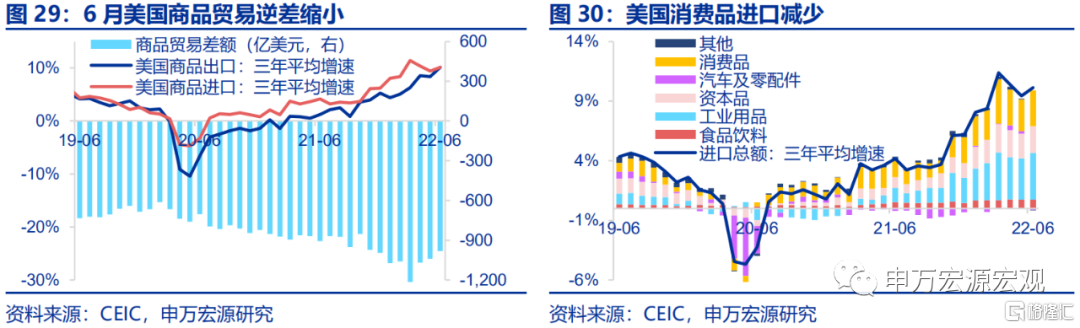 6月美国商品贸易逆差缩小至981亿美元,较3月峰值有所改善。从进口结构来看,主要是消费品进口缩减,主要受到美国居民消费需求降温的影响。