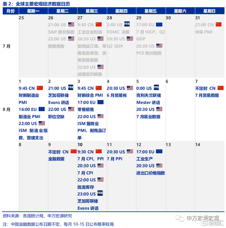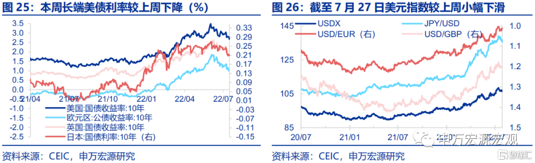 7月美联储会议之后,长端、短端美债利率均大幅下滑,反映美联储紧缩预期大大放缓,而在周四公布美国低于预期的二季度GDP后,美元指数出现大幅下滑,主要由于美国经济前景下修,日元相对美元汇率本周也出现大幅上涨。在本周美国经济衰退预期催化下,黄金价格较上周上行1%。
