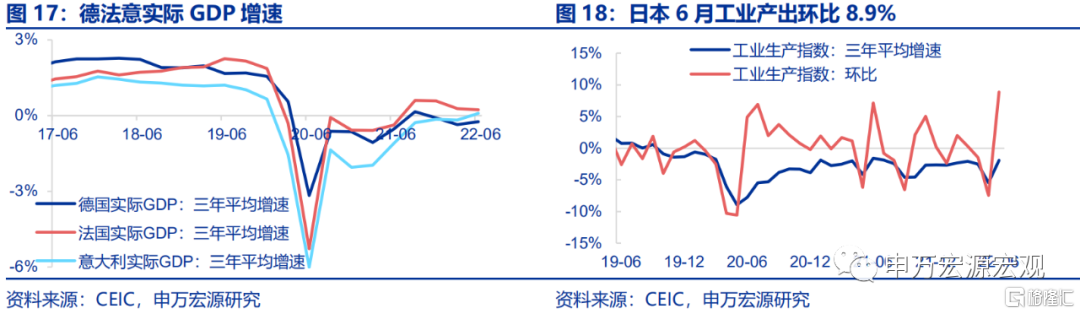 6月美国耐用品新订单环比1.8%,三年平均增速7.5%,较上月继续改善,但在美联储紧缩导致居民消费降温,高油价抑制工业生产的情况下,预计耐用品新订单增速后续回落。美国6月零售库存增速继续上升,但后续可能也会随着经济衰退预期发酵而下滑。日本工业产出环比8.9%,但相对海外其他主要发达国家仍然偏弱。德国22Q2实际GDP环比0%,低于市场预期,主要受到能源短缺、价格飙涨影响,意大利二季度GDP环比1%,好于市场预期。