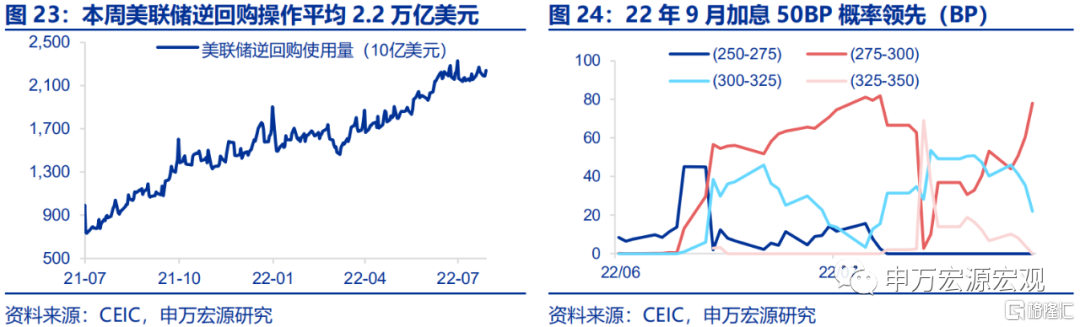 本周美联储逆回购操作平均2.2万亿美元,超过两万亿的水平显示美联储流动性仍然泛滥。市场预期美联储9月加息50BP的概率较大。