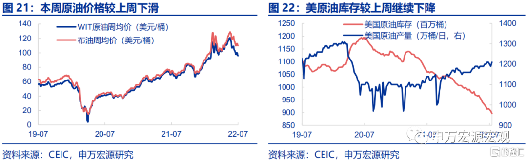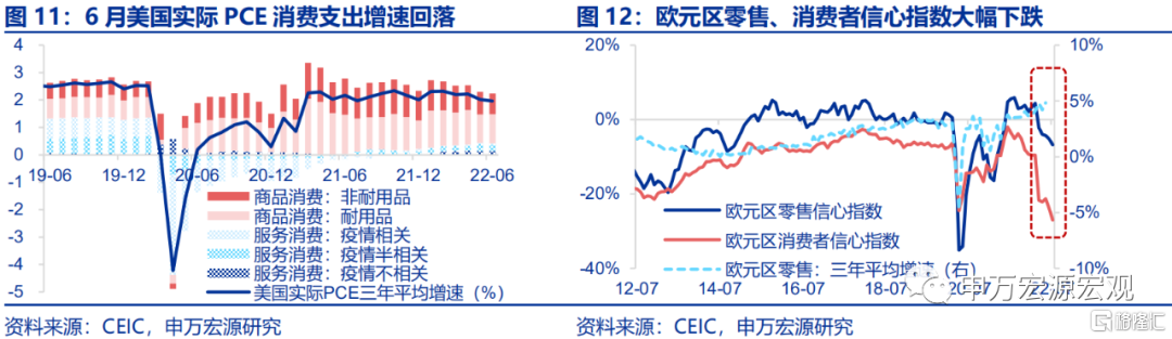 6月美国实际PCE消费支出三年平均增速下滑至2.0%,其中商品消费降温,服务业恢复趋于停滞。本周公布欧元区零售、消费者信心指数,两者分别较上月大幅下滑,显示欧洲能源短缺对居民需求形成了抑制。