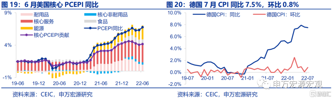 德国7月CPI同比7.5%,环比0.8%,较上月大幅反弹,显示德国通胀具备相当韧性。美国6月核心PCEPI同比4.8%,耐用品通胀下滑,而服务通胀上升。