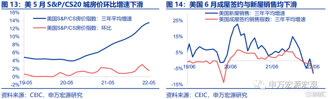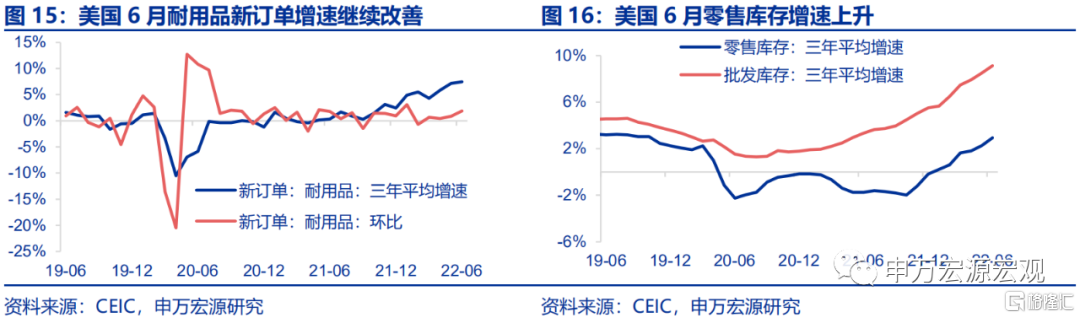 美国5月S&P房价指数环比增速回落至1.5%,显示美联储自3月开始的加息抑制效果,可能意味着后续美国通胀中房租分项的上升也将见顶。6月美国成屋签约与新屋销售三年平均增速双双跌入更深的负区间,也显示美国地产市场降温继续。