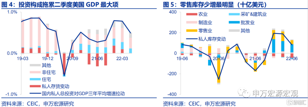 2)美联储因前期滞后于通胀曲线,而不得不在二季度大幅加快其加息步伐,10Y美债收益率大幅上行,6月中旬甚至一度接近3.5%,直接推升房贷抵押利率;利率的大幅上行、以及飙升的能源价格导致的成本抬升效应,令美国住宅投资和非住宅投资同时受到抑制,生产强度有所减弱,私人总投资环比大幅收缩-3.6%,成为美国经济陷入衰退的另一主要原因。