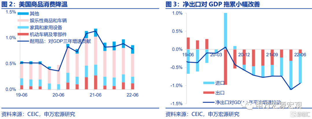 1)俄乌冲突爆发后全球油气价格飙升导致美国通胀形势进一步恶化,美联储4个月内不断加快加息速度,美国居民商品消费需求在二季度大幅收缩,环比下滑-1.1%,对美国实际GDP三年平均增速的贡献也收缩0.3个百分点至1.3%,尽管美国货物和服务贸易逆差的对应拖累也收窄0.2个百分点至-0.9%,但综合影响仍明显负面。