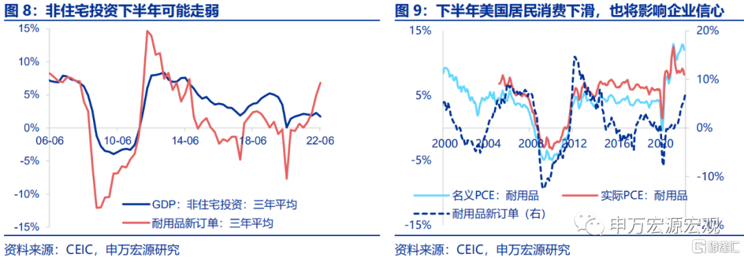 货币紧缩进程刚刚过半,能源紧张未现转机,下半年美国经济仍将面临巨大的衰退压力。1)住宅投资、居民商品消费的收缩均滞后于货币紧缩进程,Q2尚未下滑至底部,下半年仍有较大的下行风险。美国住宅投资滞后于10Y美债收益率的变化约1-2个季度,同时过去两年美国政府过度财政补贴导致的居民额外储蓄尚未完全消耗,这意味着二季度美国住宅投资和居民商品消费的下滑可能只是个开始,下半年上述两项需求大概率仍将持续降温。2)俄乌冲突以来美欧加码对俄制裁所导致的全球油气供给短缺、价格飙升问题,尚未得到有效解决,美国工业生产下半年可能持续承受重压,工业生产前景黯淡。