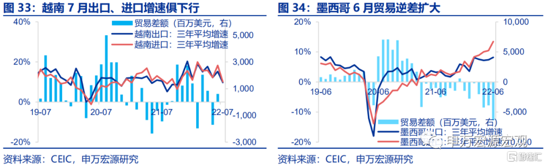 6月墨西哥贸易逆差达到64亿美元,主要受到能源进口价格飙涨的影响。泰国6月贸易逆差15亿美元,泰铢走弱、全球需求仍支持出口改善,但上半年仍出现大额贸易逆差。7月越南进出口增速俱下行,自今年2月以来越南贸易顺差已大幅收窄,不支持替代我国“出口”的逻辑。