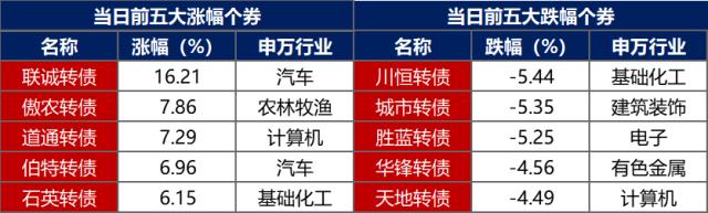 【转债市场涨幅明显收窄】 7月29日,受权益市场调整影响,中证转债、上证转债、深证转债指数分别微涨0.09%、0.06%和0.11%,涨幅明显收窄;当日转债市场成交额1176.50亿元,较前一交易日减少9.68亿元;422只个券中151只上涨,269只下跌,2只持平。当日上涨个券主要集中在汽车、农林牧渔等当日正股逆势上涨个券,其中联诚转债当日触发盘中临停,最终收涨16.21%,领涨全市场;当日,前十大涨幅个券合计成交额占比仅为20.72%。