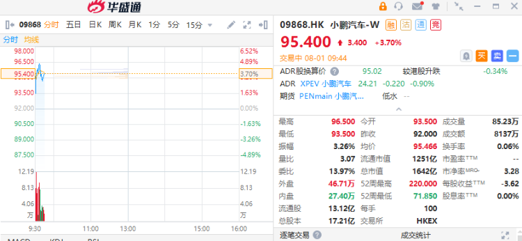 华盛资讯8月1日消息,港股新能源车板块逆市走强,截至发稿,小鹏汽车涨近4%,报95.4港元,成交额8137万港元。