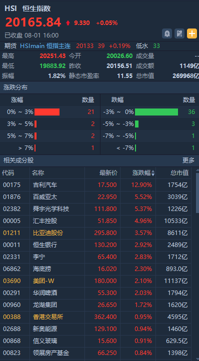 8月1日消息,美股上周表现出色,在憧憬美国加息步伐将放慢,加上个别科技股业绩胜预期,刺激美股大幅造好,纳指上升1.9%,道指及标普500指数亦分别上升近1%及1.4%。今日港股低开高走,截至收盘,恒生指数涨0.05%,报20165.84点;国企指数跌0.13%,红筹指数跌0.76%。