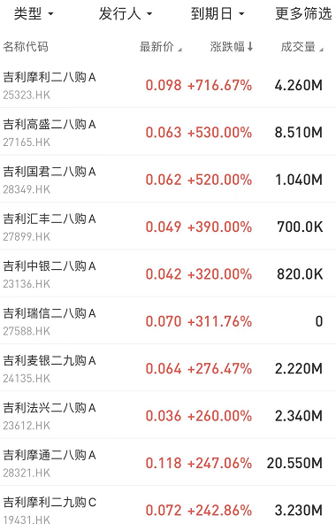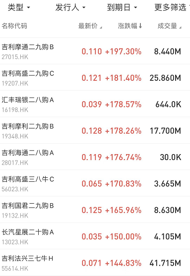 在今日涨幅榜中,吉利摩利二八购A $25323.HK 涨716.67%;吉利高盛二八购A $27165.HK 涨530.00%,今日吉利共有23只购证涨超100%。汇丰瑞银二八购A $16198.HK 涨178.57%。