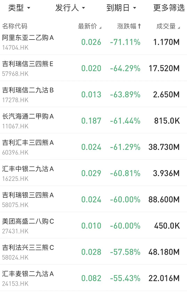 在今日跌幅榜中,阿里东亚二乙购A $14704.HK 跌71.11%;吉利瑞信三四熊E $57968.HK 跌64.29%。