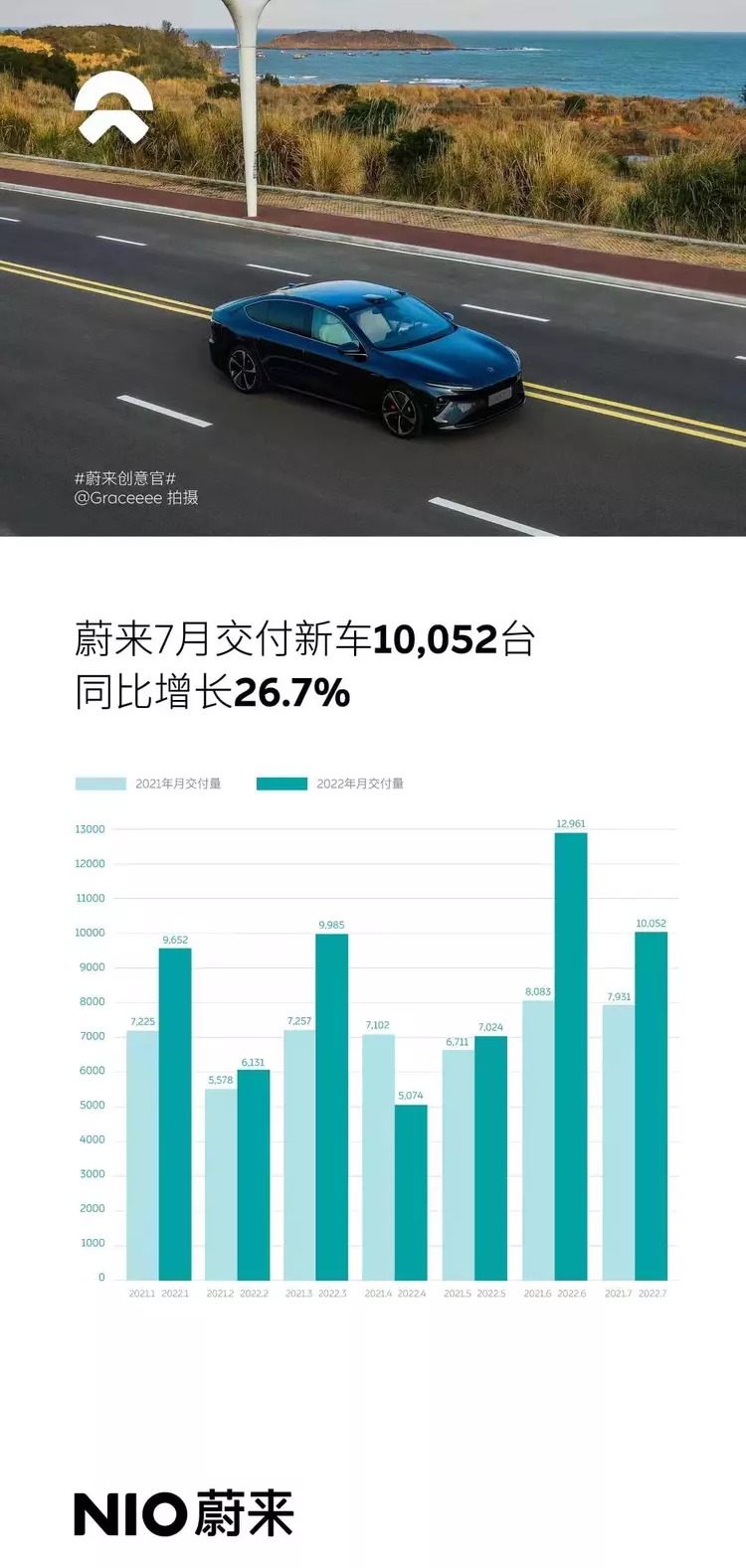 蔚来汽车:7月汽车交付量为10052辆,同比增长26.7%;2022年年初至今交付60879辆汽车,同比增长22.0%
