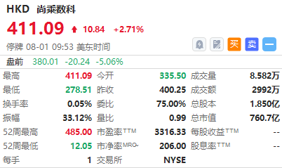 次新股尚乘数科续涨超2%,该股从7月14日登陆美股以来连续大涨,截至上周五收盘股价已经从7.8美元涨至400美元。公开资料显示,尚乘数科为尚乘集团旗下企业,而尚乘集团则是由李嘉诚的长江实业集团和和记黄埔在2003年创立,是亚洲最大的民营独立投资银行。
