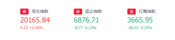 北京时间8月1日周一,港股早盘走低,恒生指数一度跌超1%下破2万点,随后大市反弹,午后维持窄幅震荡。恒生指数收盘涨0.05%报20165.84点,恒生科技指数跌0.17%,恒生国企指数跌0.13%。大市成交1148.85亿港元。