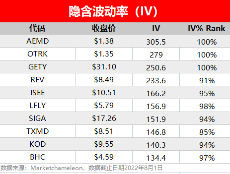 艾松乐$AEMD 、ONTARK$OTRK 隐含波动率达到305.5、279。猴痘概念股SIGA Technologies$SIGA 隐含波动率仍居高不下,达到151.9;此前美国加利福尼亚州州长于8月1日宣布该州进入紧急状态,成为继纽约州、伊利诺伊州之后第三个因猴痘宣布进入紧急状态的州。