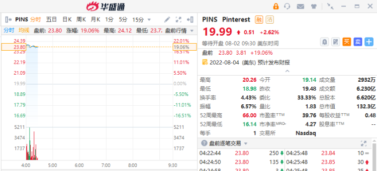 Pinterest盘前大涨,截至发稿涨幅19.06%,报19.99美元。