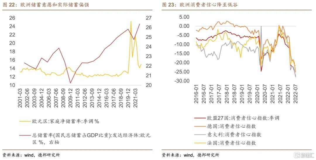 需求端来看,欧洲增长趋弱态势明显。7月欧元区Markit制造业PMI下滑至荣枯线以下,7月读数49.4为2020年8月以来新低;7月服务业PMI也快速由6月的53.0继续下滑至50.6。欧洲疫情以来实施的财政刺激规模偏弱,缺乏较大规模的财政补贴,欧元区总储蓄率持续上行,家庭净储蓄率边际上行意愿较强,居民消费偏弱,欧元区主要国家消费者信心指数在负区间内继续回落,甚至低于2008年次贷危机时期的水平。在供给收缩叠加加息带来的需求收缩的双重冲击下,欧洲经济长期增长的动能偏弱,欧洲经济衰退预期的兑现大概率先于美国。