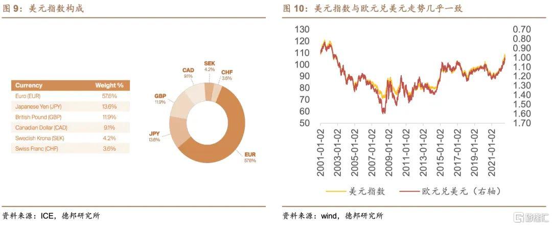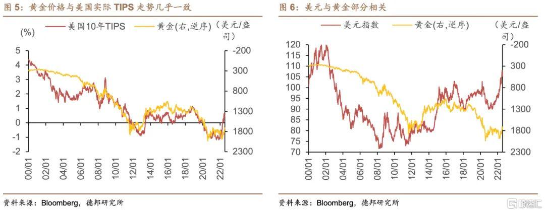 从表观数据上看,在驱动美元指数变化的因素当中,确实有很大一部分与驱动TIPS变化的因素有交叉。美元指数参照1973年3月六种货币对美元汇率变化的几何平均加权值,而其中欧元占比最高(57.6%),因此美元指数的变化几乎跟欧元兑美元的走势一致。在之前关于出口和汇率的报告中我们曾经阐述过,一国汇率水平与金融部门对该国货币的需求有关,主要由其与国外TIPS利差的预期决定,TIPS利差的预期驱动因素为两国的经济预期差、通胀预期差与货币政策预期差。因此,影响美国TIPS变化的因素在一定程度上也会带来对美元的影响,在美元和黄金的趋势变化同步的阶段,本质上仍然还是美国TIPS变化主导了黄金价格的变化。