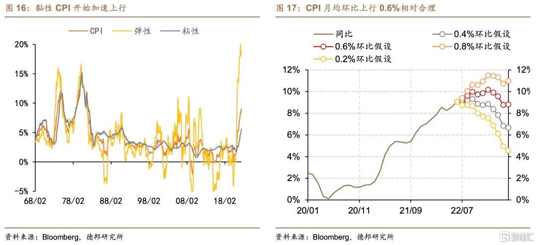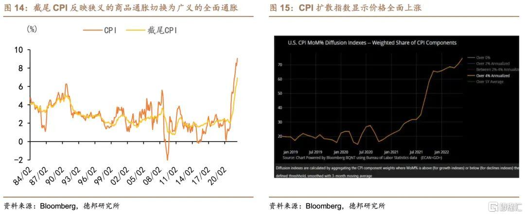 通过观察彭博编制的通胀扩散指数(diffusion index),可发现环比涨幅加速(超过4%)的项目占比在变多。换言之,当前美国所面临的已经不再是少数高波动、高弹性项目带动指数通胀上涨的结构问题,而是全面的、广泛的价格上涨问题。这意味着,就算后续商品通胀出现回落,通胀黏性的特性也会极大地放缓指数通胀下行的速率。